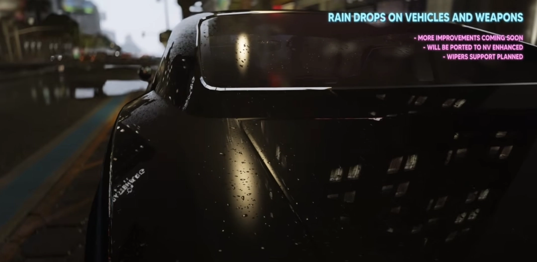 NaturalVision Evolved(进化版)更新则支持游戏版本1.0.3725.0。更新内容包括:新增特殊着色器,为水坑提供屏幕空间反射效果;新增雨滴着色器,使雨滴能够在载具和武器上出现;新增屏幕雨滴效果,雨滴会根据载具移动速度在屏幕上滑动。此外,该模组改进了体积雾着色器,提升了整体性能,并优化了雨天的光照和色彩平衡。