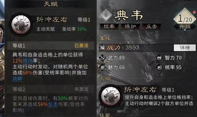 他的天赋技能触发时,可使自身及处于其追击范围内的友方武将均获得格挡率提高的增益。典韦主动行动时,会对随机两名敌方目标造成伤害,并为他们施加挑衅状态。