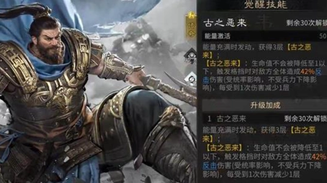 若想进一步挖掘典韦的潜力,玩家可以优先帮助他完成觉醒。觉醒后的典韦将获得名为“古之恶来”的强大技能。当典韦能量充满时,此技能会为他叠加三层效果,每次受到伤害会减少一层。这个效果赋予了典韦极强的生存能力,只要他身上存在“古之恶来”的层数,其生命值就不会降至1点以下,这意味着他不会被轻易击败。