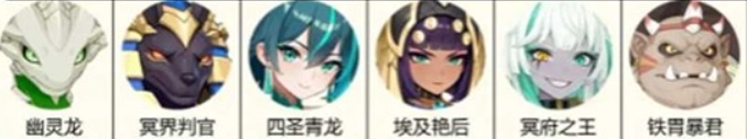 青龙有多种选择。一套阵容的前排可以选择冥界判官来承担主要伤害,输出位搭配四圣青龙、埃及艳后和冥府之王,另一个输出位置可以选择铁卫暴君