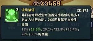 1、弗莉达的技能围绕“治疗+增益”展开,核心技能优先级:1技能(主治疗)>4技能(终伤加成)>3技能(防御加成)>2技能(闪避加成)。