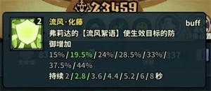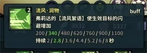 3、被动技能:流风·化藤(防御增加)效果:使生效目标的闪避值增加900,持续时间6秒。尤其搭配锤锤等闪避型坦克时,可进一步提升队伍闪避收益,前期渡过高压关卡效果显著。