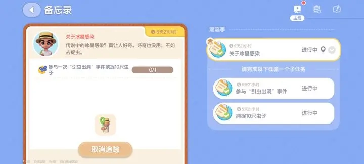 参加一次引虫出洞活动,或者随便抓十只虫,都能完成任务。完成抓虫后,再找到浪花对话,即可完成第二天的筹备任务。