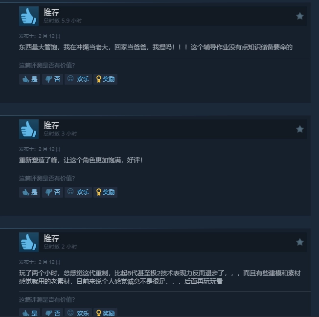 目前,这款游戏在Steam平台的好评率达72%,处于“多半好评”区间。不少玩家依旧给出了正面评价,他们提到游戏内容丰富充实,能让玩家获得充足的体验感,同时对角色的重新塑造也给予了认可。
