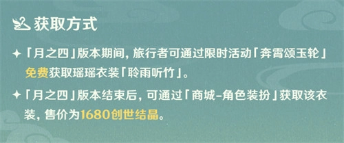 原神角色瑶瑶的衣装「聆雨听竹」将随「月之四」版本一同上线,旅行者能够借助限时活动「奔霄颂玉轮」免费获取这套衣装。待版本结束后,大家可前往「商城-角色装扮」板块购买该衣装,其售价为1680创世结晶。