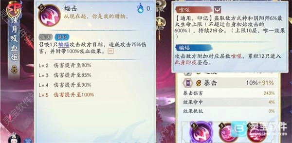 蝠影漫天,月蚀长夜,召唤3只蝙蝠攻击敌方目标3次,每次造成攻击125%伤害,然后召唤编蝠对敌方全体造成攻击125%伤害,该伤害不触发目标的御魂及被动,附带100%吸血。