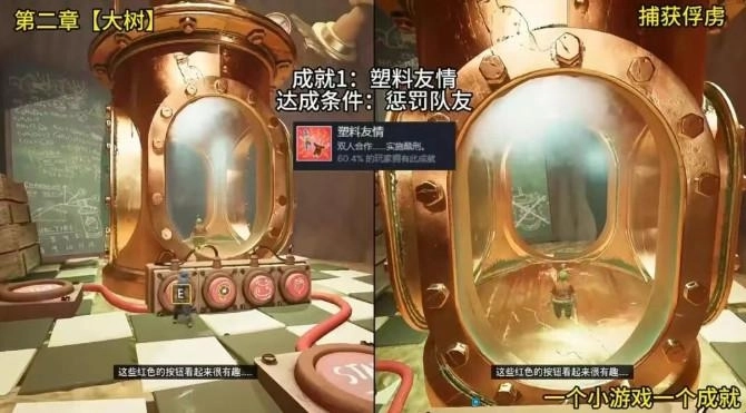 在破坏一个树藤门后,继续前进右边有岔路,按下按钮惩罚队友,两名玩家同时解锁成就