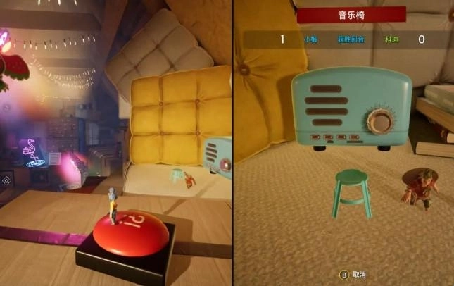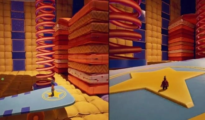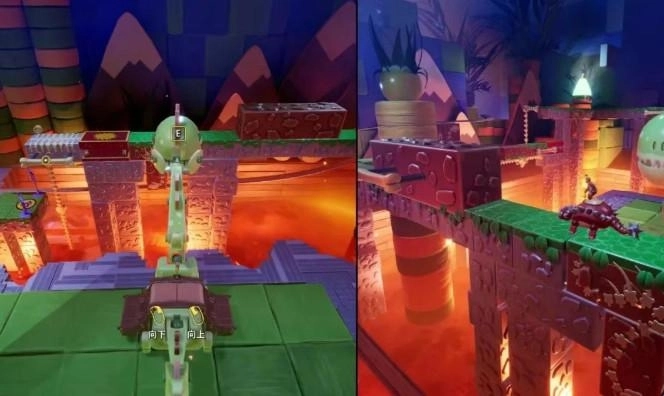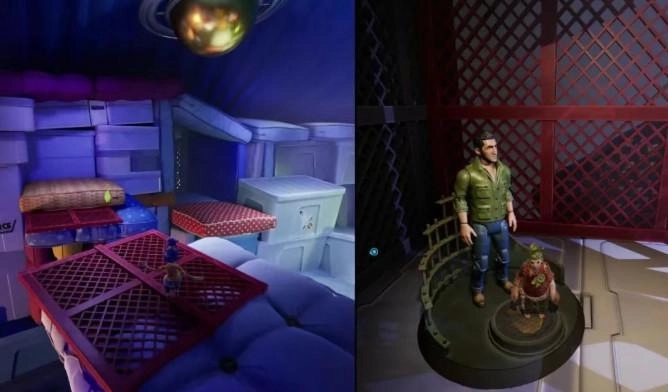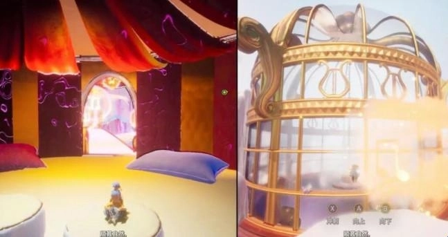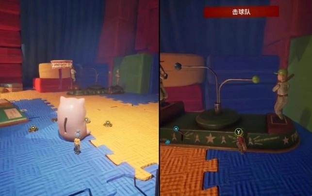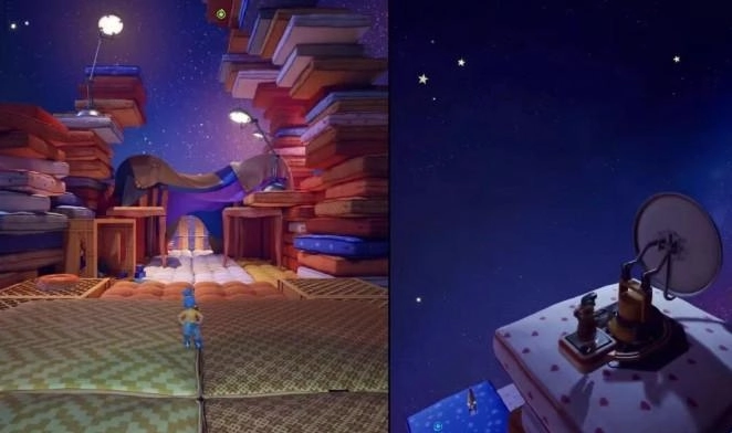 穿过星型灯和手电筒后,跳上手电筒右边的枕头平台进入左手边房间,里面有两雕像,同时踩下,两名玩家同时解锁成就