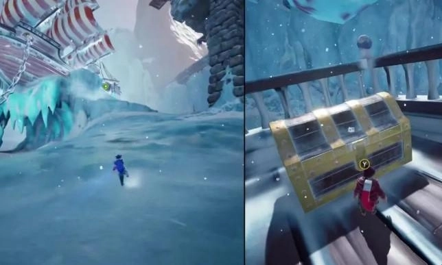 在水下基地上浮,有一艘大海贼船在冰面上,进入船有一个宝箱,打开宝箱,里面有两个帽子,戴上帽子,谁戴帽子谁解锁成就