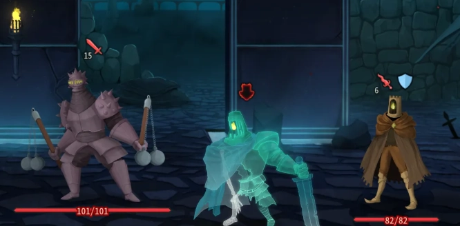 在三层前两次打分都比较保守,主要是因为骑士三人组——这绝对是三层最阴间的精英怪。从左到右分别是连枷骑士、幽灵骑士和魔法骑士。中间的幽灵骑士会施加恶咒,只要他活着,你的所有卡牌都会带有虚无效果,如果不优先处理他,卡牌会越打越少,要是第一回合没有补费手段还全上核心卡,那会非常棘手。最右边的魔法骑士存活时会让你所有卡牌降级,导致卡组整体强度下降。最左边的连枷骑士血量最厚,伤害也高。关于击杀优先级,推荐幽灵骑士≥魔法骑士>连枷骑士,不过要是你玩的是大卡组,不担心卡牌消耗,也可以先杀魔法骑士。