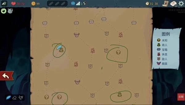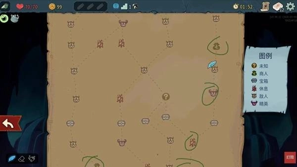 再来是地图规划,也就是路径的选择方向。每一层开始时你就可以在地图看到整层塔的路线,而我推荐的地点次序是:商店 > 未知地区 >菁英怪。因为商店是稳定的删卡来源,菁英怪则会掉落强力卡牌及遗物,但相对的很可能让你角色状态大减,是用血量来换取的资源。