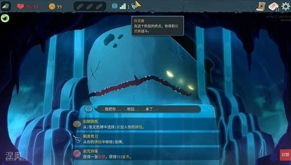 每一层boss是一开始就决定了的,例如这边看到最后的boss是仪式兽,它在150血会自身晕眩停止行动,但后续也会进化出晕眩技能,让我们该回合只能使用1张卡牌。对抗时可以优先保留虚弱及格挡药水,以免弱势时期被打死。