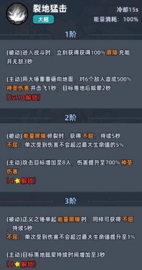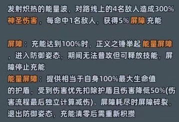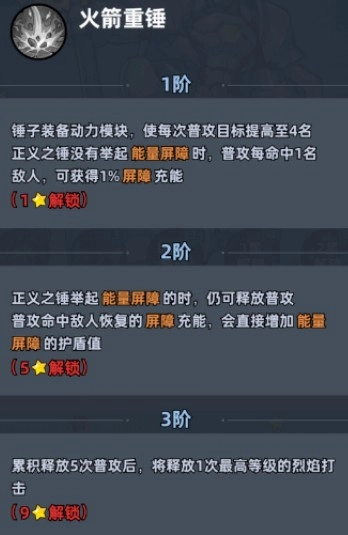 4.火箭重锤:每次普攻目标提升4名,命中1名敌人可以获得屏障充能。5星后会解锁正义之锤的最强形态,举起能量屏障可以释放普攻,并且会直接增加护盾值,等于可以无限护盾,当然要实战看看恢复情况。