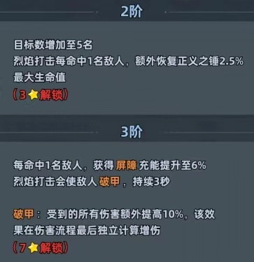 升到3星之后,不仅可以增加攻击目标数量,还能恢复生命值。7星之后还能增加屏障充能数值和破甲效果。