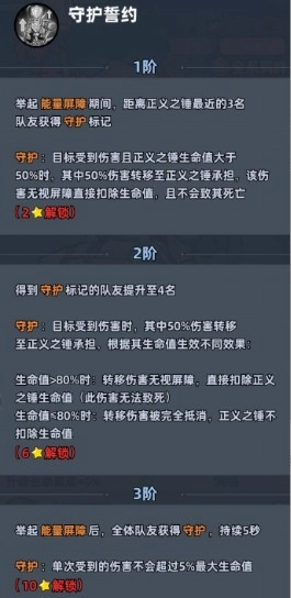 5.守护誓言:在举起能量屏障的过程中,会为距离最近的3名队友施加【守护】标记,该标记能够将队友受到的伤害转移至正义之锤。