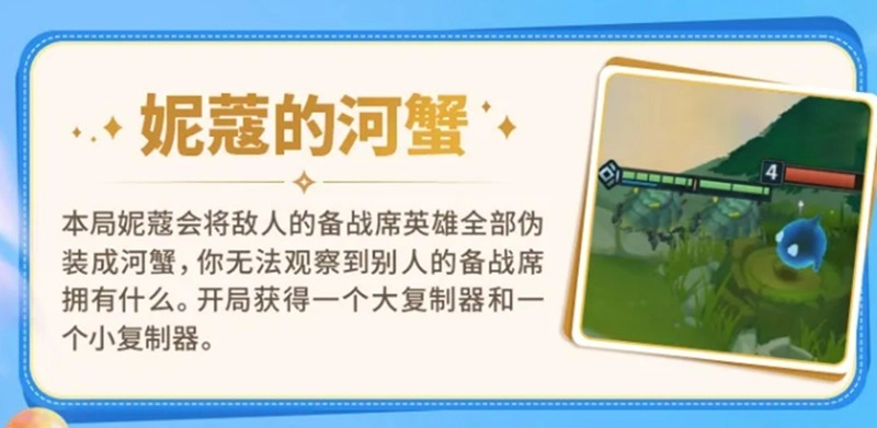 妮寇的河蟹会隐藏所有对手的备战席,对方的英雄图标都会变成河蟹,让你无法判断他们正在组建什么阵容。作为补偿,游戏一开始就会送你一个大复制器和一个小复制器。这个效果大大削弱了通过观察对手来调整自己策略的能力,玩家需要改变习惯,不再依赖对手的信息,而是专注于运营自己的经济和尽快让核心羁绊成型。复制器应该优先用来复制你已经确定要培养的低费核心卡,或者关键的高费卡,避免随意使用造成浪费。