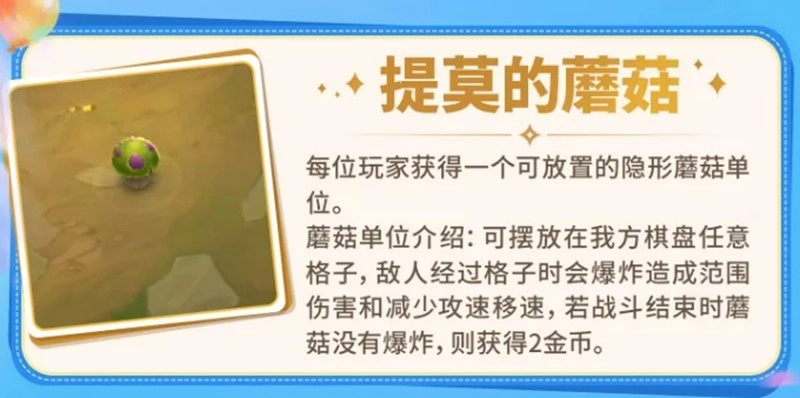 提莫的蘑菇会给你一个可以部署在自己棋盘上的隐形单位。敌人经过时会触发爆炸,造成范围伤害并降低目标15%的攻速和移速,效果持续3秒。如果整场战斗蘑菇都没有被触发,那么你会收回2金币。这是一个功能性的辅助效果,放置的位置需要结合敌人常见的站位来预判,比如后排输出常待的区域,如果随便乱放很可能就浪费了。