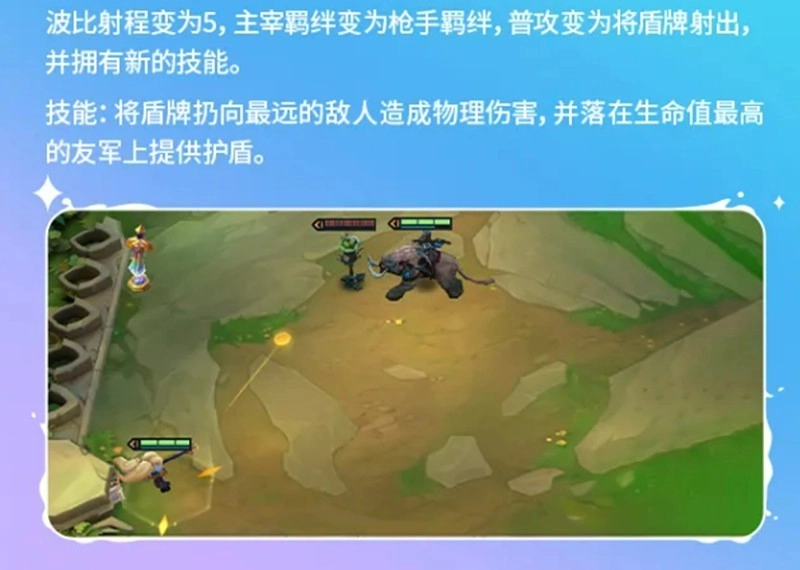 炮形态波比彻底改变了波比的定位。她的射程会扩展到5格,主宰羁绊会被替换为枪手羁绊。她的普通攻击会变成投掷盾牌,而技能则会锁定最远的敌方单位造成物理伤害,落地点会自动选择生命值最高的友军并为其施加一个护盾。这个改动强化了她的远程压制能力和团队保护能力,特别适合与高血量的前排坦克,比如奥恩或龙龟搭配,形成“盾牌加护盾”的双重生存保障体系。
