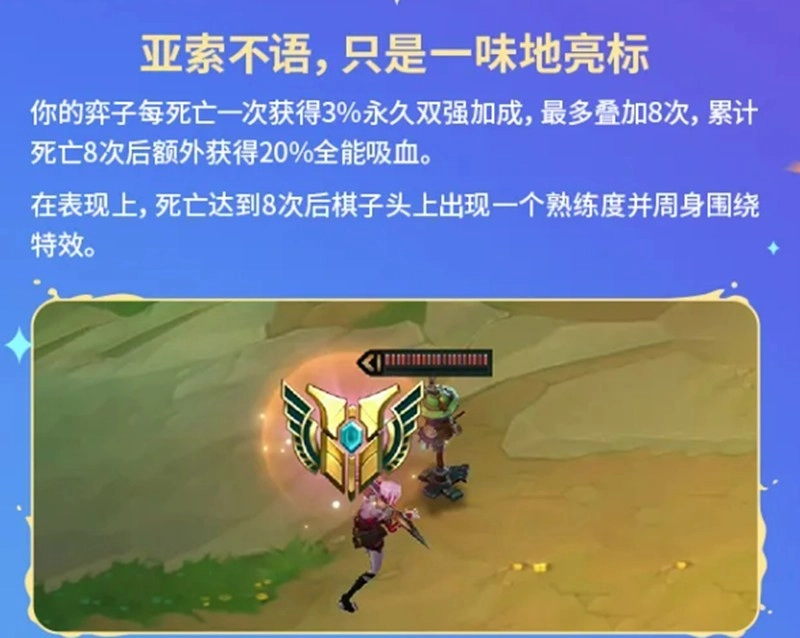 托儿索是一个依靠阵亡来叠加效果的符文。单个棋子每阵亡一次,你的全队就会获得3%的双抗永久加成,最多可以叠加8次。叠满之后,还会额外赋予全队20%的全能吸血,并且在棋子头顶生成专属特效。这个机制鼓励玩家主动规划减员节奏,可以在中期通过可控的牺牲来快速叠满层数,到了后期凭借高额的抗性和吸血能力,实现整体持续作战能力的飞跃。